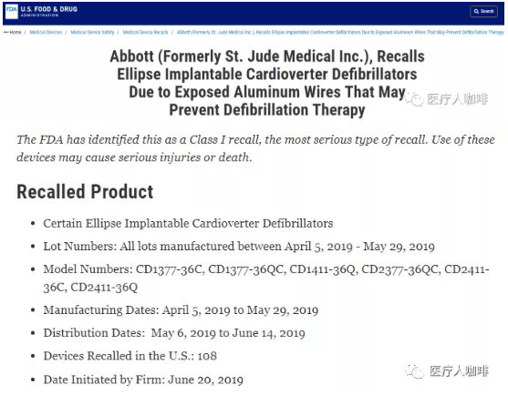 8月5日,F(xiàn)DA 發(fā)布醫(yī)療器械一級(jí)召回事件公告,將雅培圣猶達(dá)公司召回 Ellipse 植入型心律轉(zhuǎn)復(fù)除顫器(ICD)視為一級(jí)召回,一級(jí)是最嚴(yán)重的召回類型,因?yàn)榭赡軐?dǎo)致嚴(yán)重傷害或患者死亡。