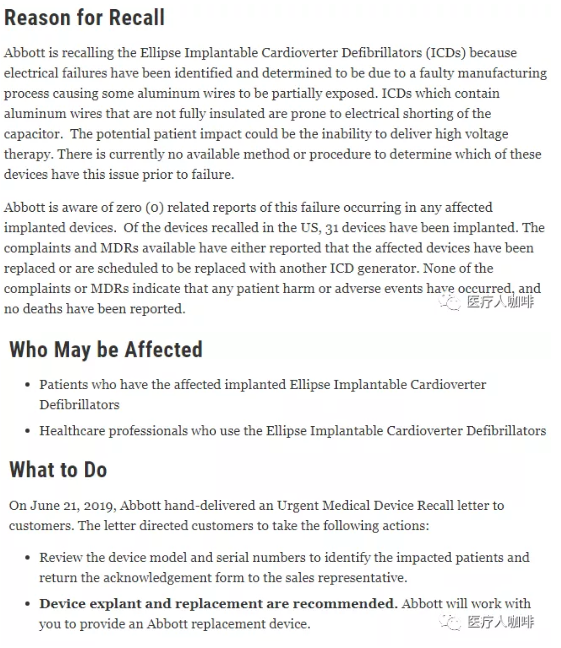 雅培于 6 月 21 日向客戶發(fā)送了緊急醫(yī)療設(shè)備召回函,要求檢查設(shè)備型號(hào)和序列號(hào)以識(shí)別受影響的患者并將確認(rèn)表返回給銷售代表,并建議進(jìn)行設(shè)備分離和更換,雅培提供更換設(shè)備。