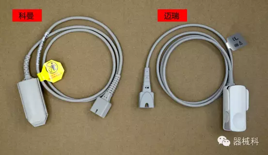 兩家使用的血氧探頭有明顯的區(qū)別??坡目瓷先ジ~瑞的設計看起來新超大氣,顏色更白。不知道用久了,會不會發(fā)黃變色??戳艘幌绿筋^的發(fā)光管和接收管,居然是一樣的,從發(fā)光管和接收管的外形上看用的都是OSI的,看來在這一點上大家都比較認可這家頂級老牌生產的管子。用手指感受了一下兩家的探頭,邁瑞的選用的材料比較柔軟,在感受上比較舒適,科曼的探頭襯墊手感上要硬朗一些,不過也不會有任何的不適。