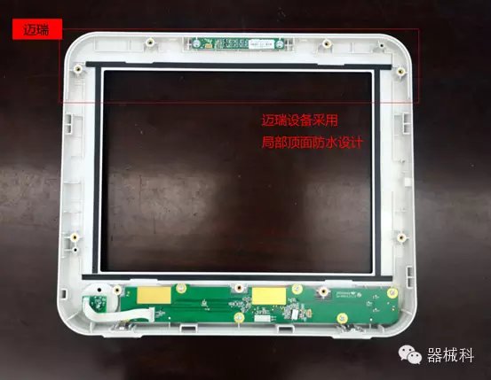 防水是所有電子類產品的一個重要功能。如果防水功能設計不好,儀器很容易受潮,從而引起使用不便,嚴重的將會報廢??坡昂髿ぶg采用硅膠密封線整圈的防水設計,做工更麻煩,耗材多,但更安全;邁瑞前后殼之間采用硅膠密封線頂部的局部防水設計,省時省料,但存在安全隱患。